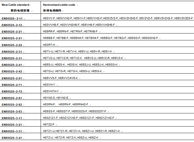 EN標(biāo)準(zhǔn)和HD電線型號對照表