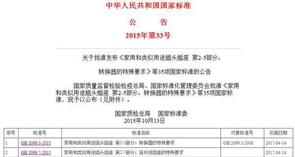 目前插線板行業(yè)俗稱的新國標是指國家質(zhì)檢總局、國家標準委2015年10月批準發(fā)布的GB 2099.3-2015《家用和類似用途插頭插座 第2-5部分:轉(zhuǎn)換器的特殊要求》、GB 2099.7-2015《家用和類似用途插頭插座 第2-7部分:延長線插座的特殊要求》