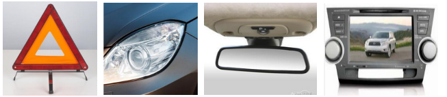 零部件-車燈與燈泡、各種視鏡、輪胎、輪圈、剎車系統、喇叭、防盜設備、安全帶、汽車玻璃、內飾件等;