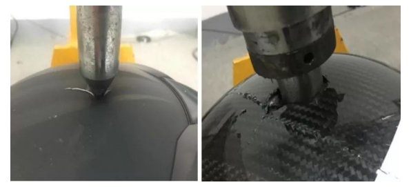 合格品(左)與不合格品(右)頭盔穿透性能試驗結果