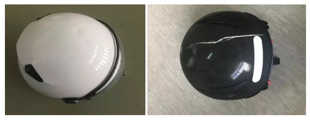 合格品(左)和不合格品(右)頭盔的碰撞試驗結果現象