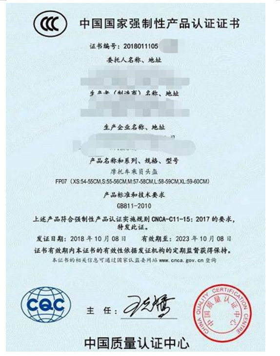 【摩托車頭盔的CCC證書模板】