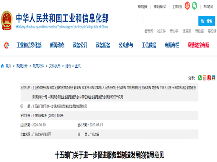 為貫徹黨中央、國務(wù)院關(guān)于推動(dòng)先進(jìn)制造業(yè)和現(xiàn)代服務(wù)業(yè)深度融合,發(fā)展服務(wù)型制造的決策部署,推動(dòng)制造業(yè)高質(zhì)量發(fā)展,工業(yè)和信息化部會(huì)同發(fā)展改革委、教育部、科技部、財(cái)政部、人力資源社會(huì)保障部、自然資源部、生態(tài)環(huán)境部、商務(wù)部、人民銀行、市場監(jiān)管總局、統(tǒng)計(jì)局、銀保監(jiān)會(huì)、證監(jiān)會(huì)、知識(shí)產(chǎn)權(quán)局等15部門聯(lián)合印發(fā)了《關(guān)于進(jìn)一步促進(jìn)服務(wù)型制造發(fā)展的指導(dǎo)意見》(下稱《指導(dǎo)意見》)。
