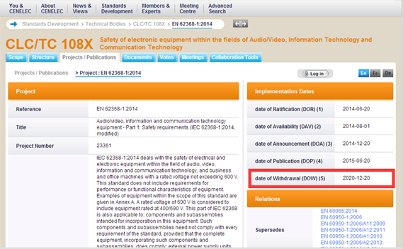 注:依據歐盟CE標志對于“置于市場”的時間認定,只要產品進入銷售之時就必須符合法規,說明產品在2020年12月20日起將無法以EN 60950-1與EN 60065標準進入歐盟市場。