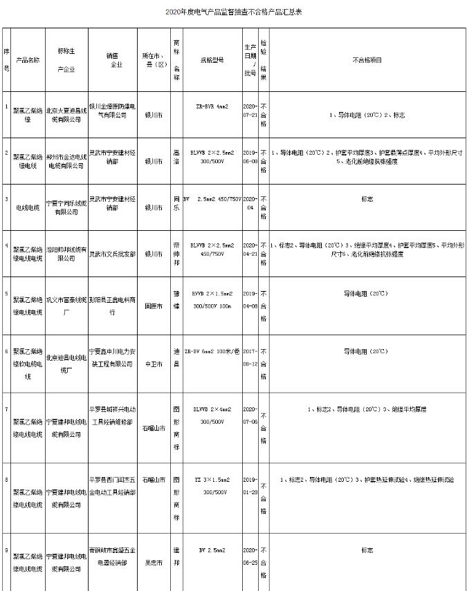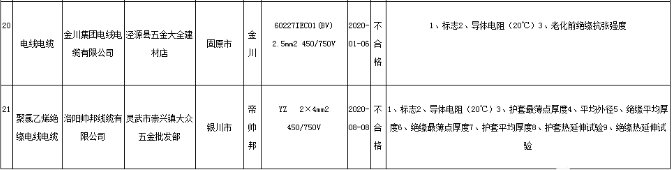 據寧夏回族自治區市場監督管理廳網站2020年11月18日發布的關于2020年度電氣和消防產品質量監督抽查結果的通報,21批次電線電纜產品抽查不合格。