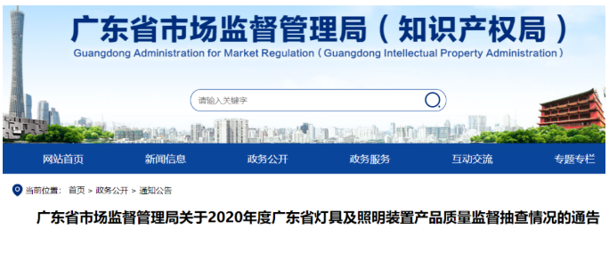 廣東省市場監(jiān)督管理局關(guān)于2020年度廣東省燈具及照明裝置產(chǎn)品質(zhì)量監(jiān)督抽查情況的通告