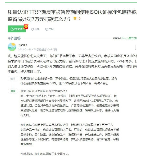 再者近期,小編在朋友圈及一些網(wǎng)絡(luò)上又看到有些同行在吐槽公司使用過(guò)期的ISO認(rèn)證證書(shū)被處罰的事情,其實(shí)這個(gè)并不是個(gè)案,很多企業(yè)主對(duì)這個(gè)并不重視,覺(jué)得有一份證書(shū)就可以了,沒(méi)必要?jiǎng)谛膭诹μ焯烊チ粢狻?/span>