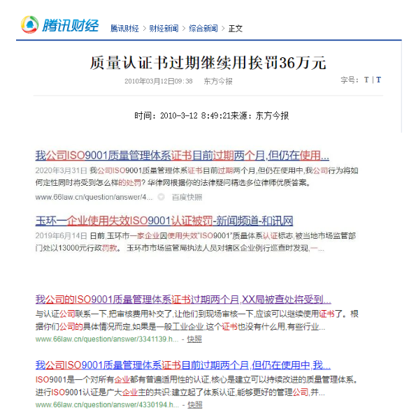 第三、他們卻經(jīng)常忽略了證書(shū)之外還有相關(guān)的法律法規(guī)在制約著這些證書(shū)的使用規(guī)范,特別是在廣告宣傳,產(chǎn)品售賣(mài),市場(chǎng)監(jiān)督的時(shí)候使用了過(guò)期的證書(shū)是要被處罰的,情節(jié)嚴(yán)重的甚至要被吊銷(xiāo)營(yíng)業(yè)執(zhí)照。