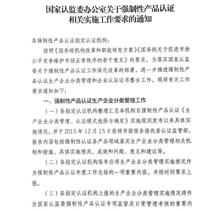 摘要: 據(jù)悉,國家認監(jiān)委今日發(fā)布了關(guān)于強制性產(chǎn)品認證相關(guān)實施工作要求的通知,將對強制性產(chǎn)品認證生產(chǎn)企業(yè)進行分類管理,并對強制性產(chǎn)品認證證書開展整合工作。