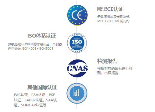 常見的CE認證,ISO體系認證,檢測報告以及其他國際認證,會根據(jù)客戶產(chǎn)品投放的市場來決定做其中一個或者多個認證項目,主力市場在國內(nèi)跟出口的話,對于證書的需求點是不一樣的。下面我們分享一下為何需要做這些認證。