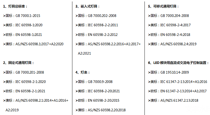 AS/NZS 60598-2-X,X代表不同類別的燈具使用不同標準。