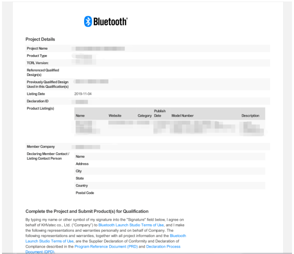2、若您終端產品里邊的藍牙模塊已通過 BQB 認證,則您的產品只需要向代理認證公司提出向藍牙 SIG協會申請購買 DID 列名登記,之后認證公司會重新出一個新的 DID 列名證書給到客戶使用。