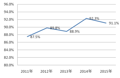 全年共抽查24505家企業生產的25345批次產品,國家產品質量監督抽查合格率為91.1%。從近5年的抽查情況看,產品抽查合格率分別為87.5%、89.8%、88.9%、92.3%和91.1%,整體呈現波動上升態勢,雖然2015年比2014年下降了1.2個百分點,但國家監督抽查合格率繼去年之后再次達到90%以上。其中,2015年加強了食品相關產品的監督抽查力度,全年共抽查3891家企業生產的4338批次產品,抽查合格率為96.8%。
